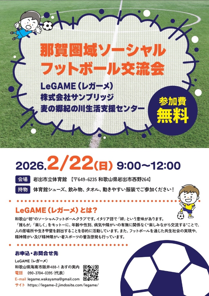 | 2月22日(日) | 那賀圏域ソーシャルフットボール交流会 (岩出市立体育館) 10:00〜12:00 |